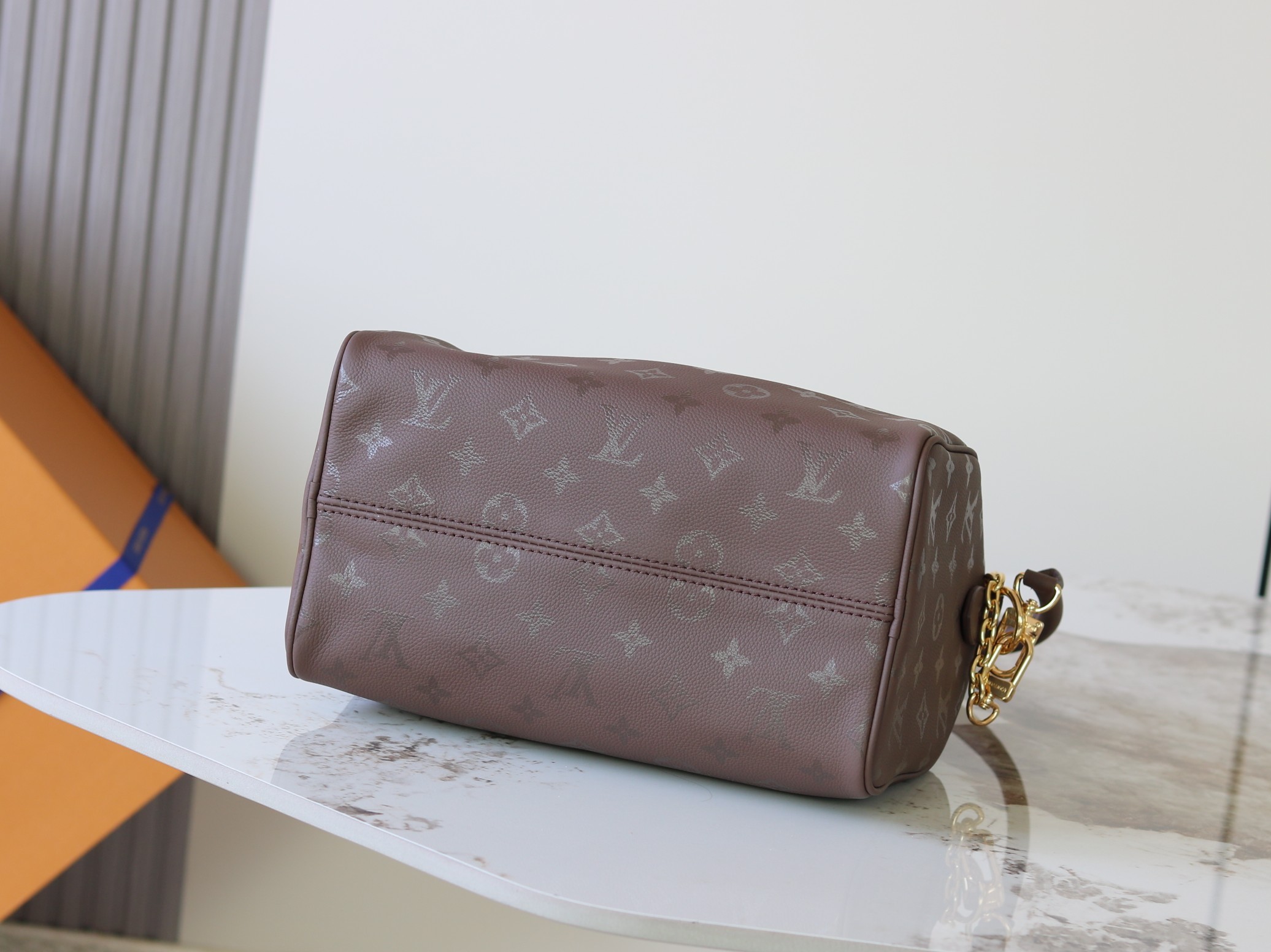 خلفية بنية داكنة مع شعار “LV” باللون العسلي اللامع
